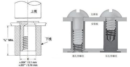 3.在上模與下模平行的情況下,施加擠壓力,將螺柱鉚接至 板材中,安裝完畢后,螺柱頭平面與安裝板面齊平。